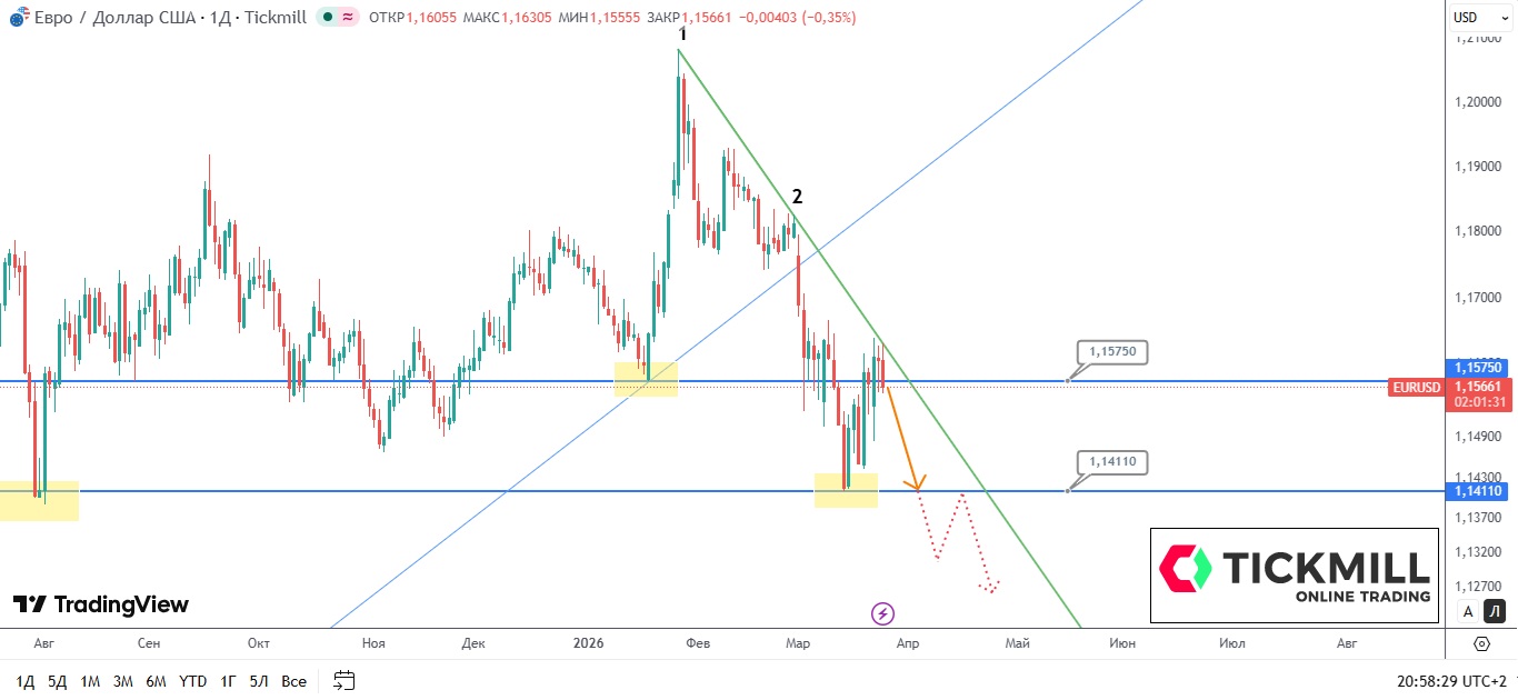 Единая валюта вплотную протестировала нисходящую линию тренда (проведённую через точки 1 и 2), но быкам не хватило импульса для пробоя. Прямо сейчас котировки пытаются закрепиться ниже психологической отметки 1.1575, попутно формируя на дневном графике зловещий паттерн "вечерняя звезда".